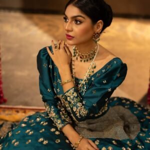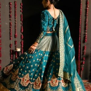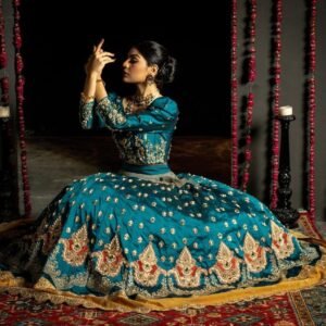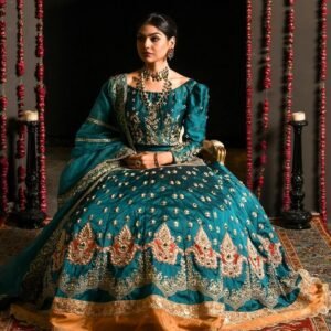 This stunning outfit features a flowy silhouette that moves beautifully, paired with a richly embroidered choli. The regal blend of traditional motifs and contemporary elegance makes it a standout piece for any formal occasion or wedding event.