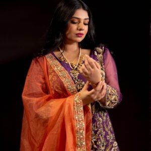 - Vibrant Color Palette: A striking combination of royal purple, rich gold, shimmering silver-blue, and a pop of contrast with a festive orange dupatta.