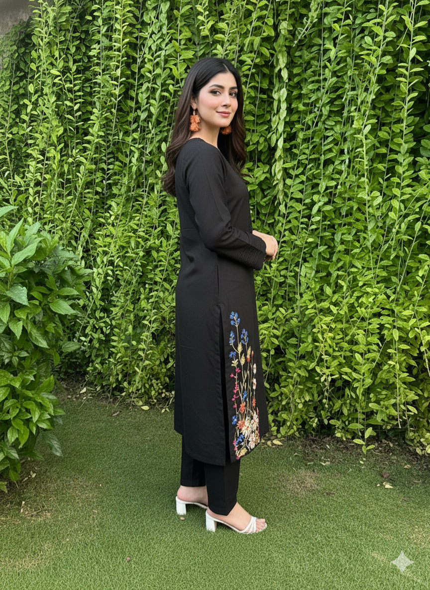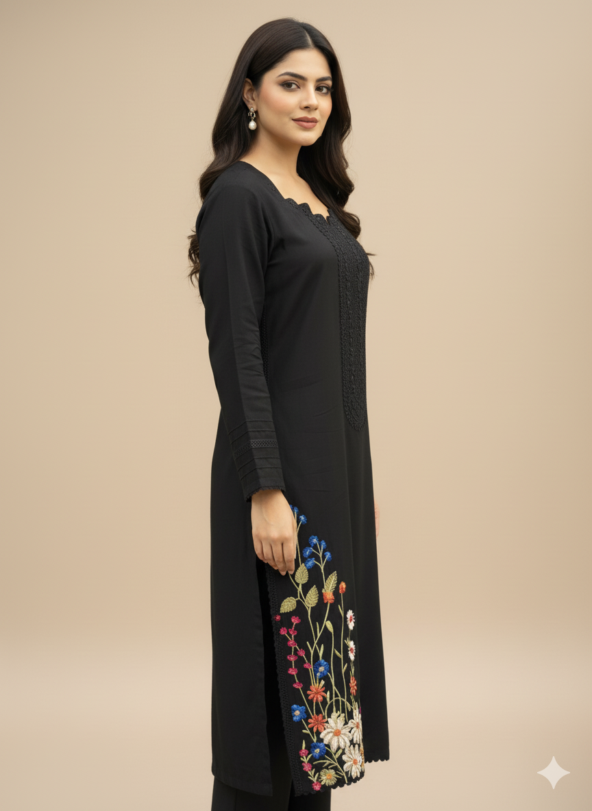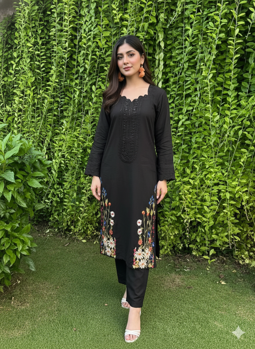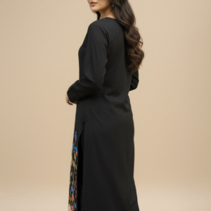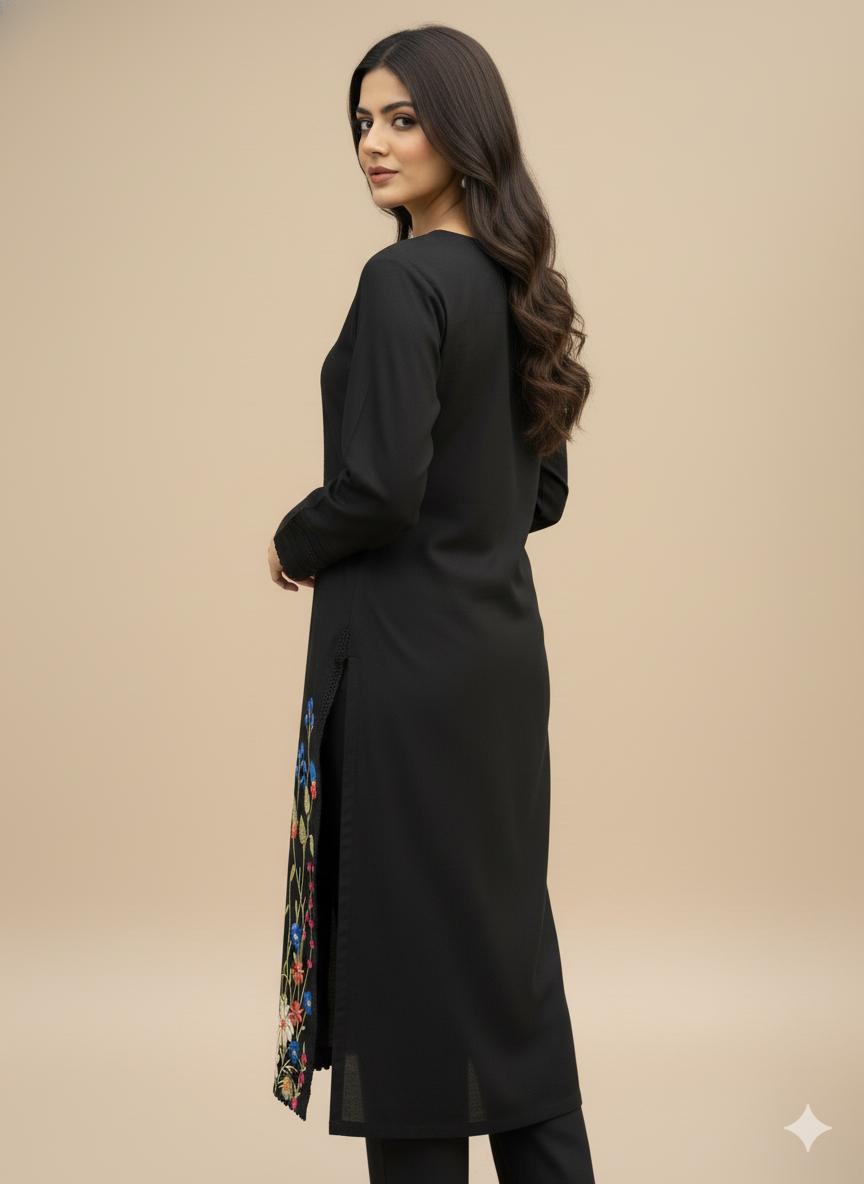 Introducing the “Midnight Bloom” Thi Silk Ensemble by Kuts By Mahwish. This stunning two-piece suit is crafted from luxurious Thi Silk in a deep, rich black. The kurta features an intricately embroidered neckline with delicate scalloped detailing, adding a touch of classic elegance. What truly makes this piece stand out are the vibrant, multi-colored floral embroidery motifs gracefully adorning the side panels, bringing a lively contrast to the dark fabric. Paired with comfortable matching trousers, this ensemble is perfect for semi-formal gatherings, evening events, or adding a unique flair to your daily wear. Experience the perfect blend of traditional craftsmanship and contemporary style. Price: PKR 5,900.
