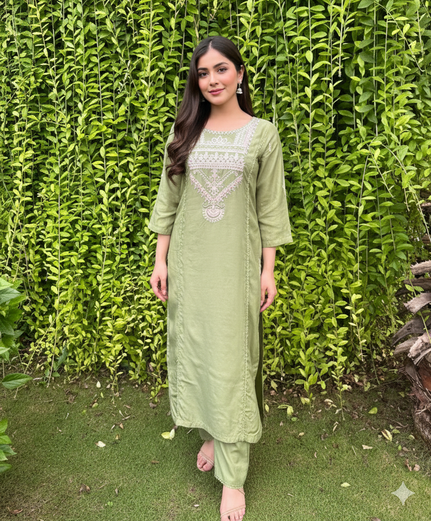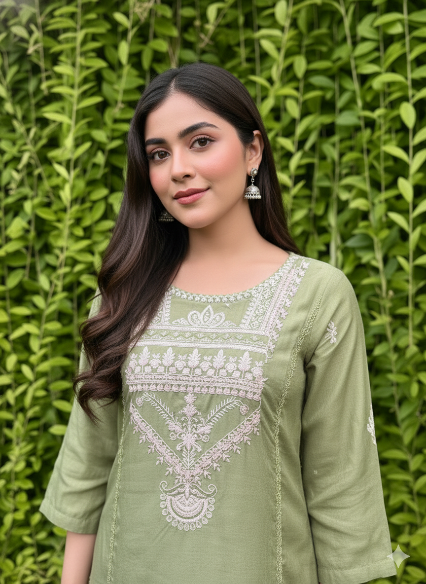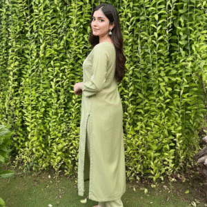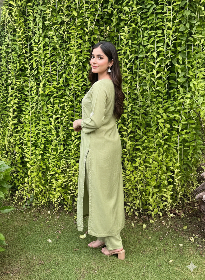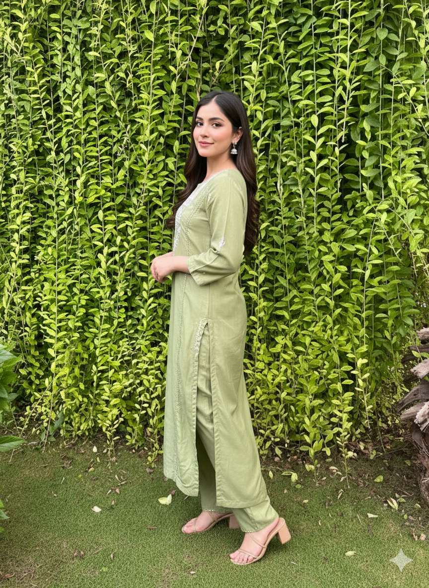 Discover the “Pistachio Serenity” Thi Silk Ensemble by Kuts By Mahwish. This charming two-piece suit is crafted from luxurious Thi Silk in a soothing pistachio green hue, perfect for bringing a fresh and elegant touch to your wardrobe. The kurta is adorned with intricate white embroidery around the neckline, creating a beautiful contrast and adding a touch of traditional artistry. Designed for comfort and effortless style, this ensemble is ideal for daytime events, casual outings, or adding a sophisticated pop of color to your everyday look. Experience the harmonious blend of premium fabric and delicate craftsmanship. Price: PKR 5,600.