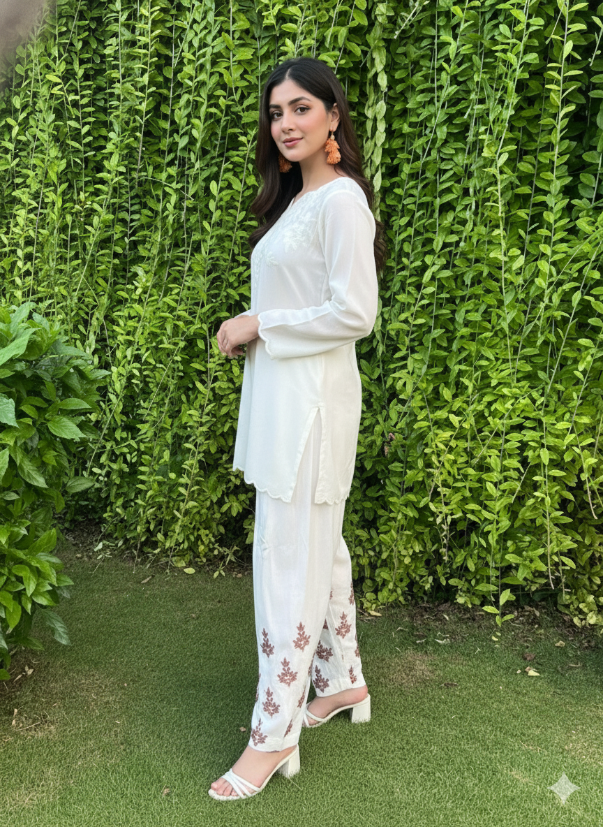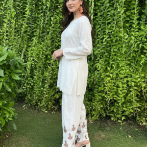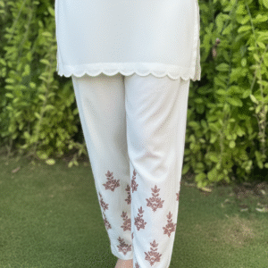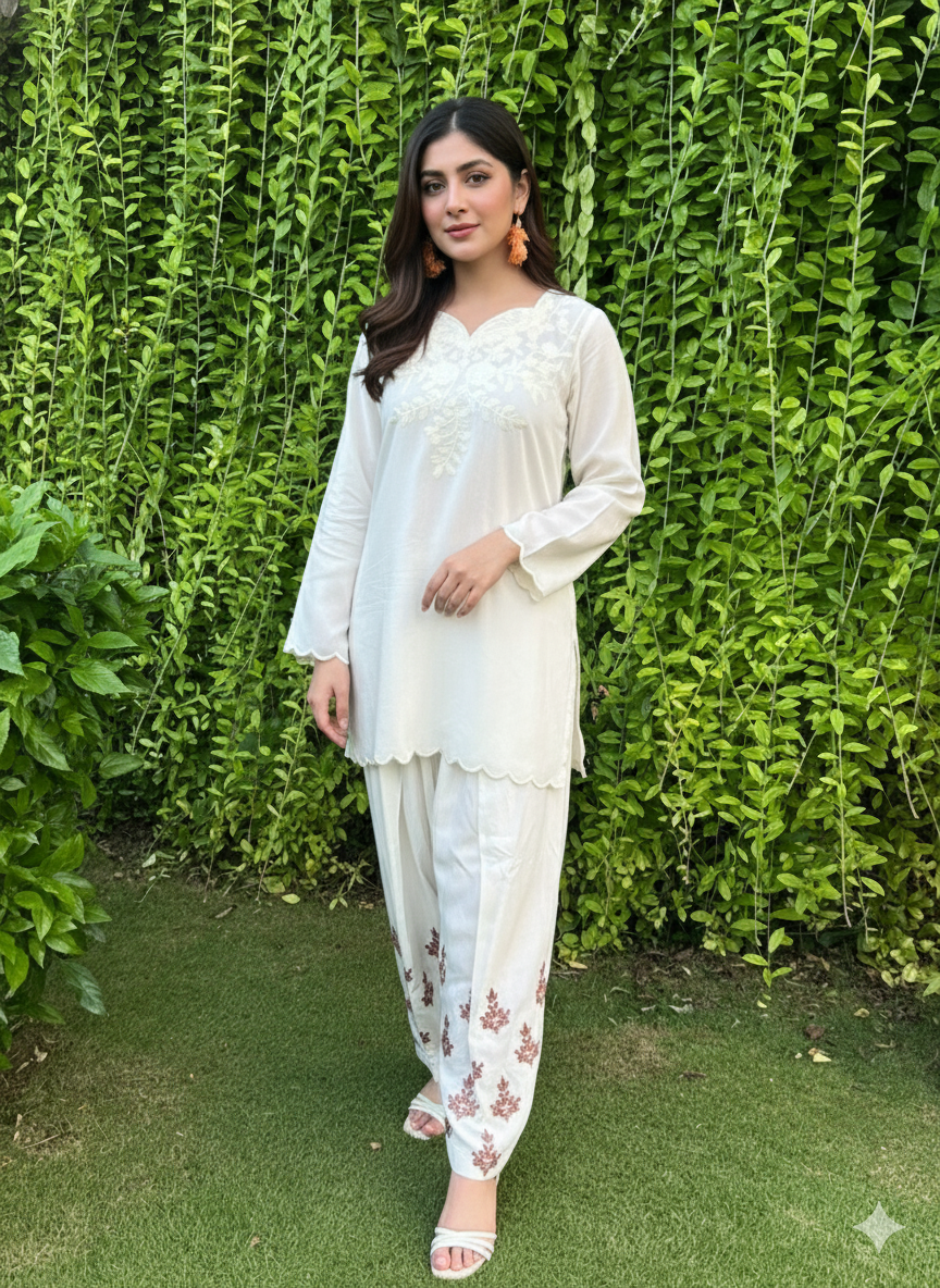 Introducing the “Pearl Petals” Thi Silk Ensemble by Kuts By Mahwish. Crafted from luxurious Thi Silk in a pristine white hue, this two-piece set offers both exceptional comfort and sophisticated style. The elegant kurta features intricate tone-on-tone embroidery across the neckline and subtle detailing, while the matching salwar is adorned with charming floral motifs along the hem. Designed for versatility, it’s ideal for daytime events, casual gatherings, or adding a touch of understated glamour to your everyday wardrobe. Experience the blend of premium fabric and exquisite craftsmanship. Price: PKR 6,500.
